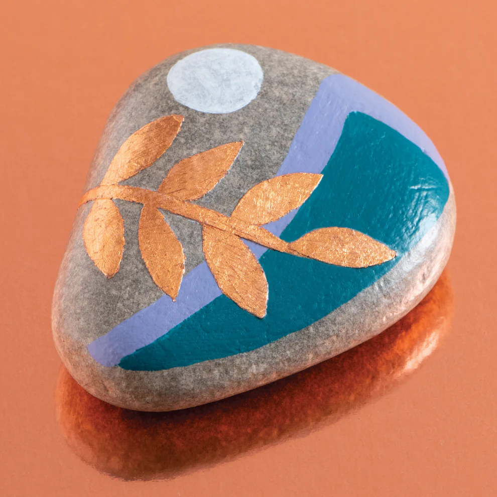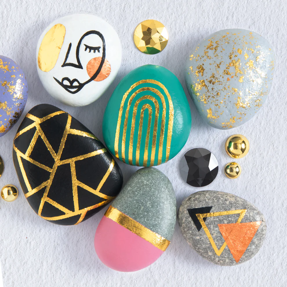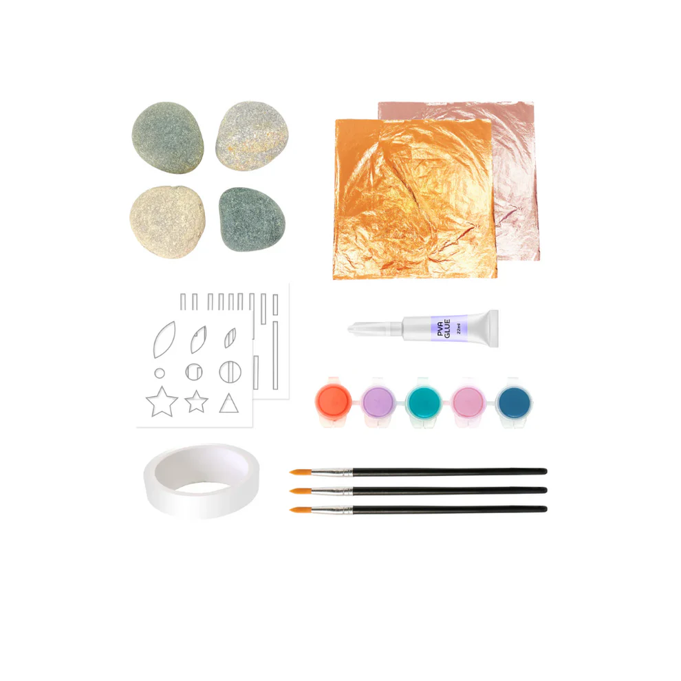• INCLUDES GOLD AND ROSE-GOLD METAL-FOIL LEAF SHEETS, DOUBLE-SIDED TAPE, GLUE, 5 PAINTS (INCLUDING WHITE AND BLACK AS BASES AND FOR MIXING AND 3 STYLISH HUES), 2 STENCILS, 3 PAINTBRUSHES AND 4 ROCKS.