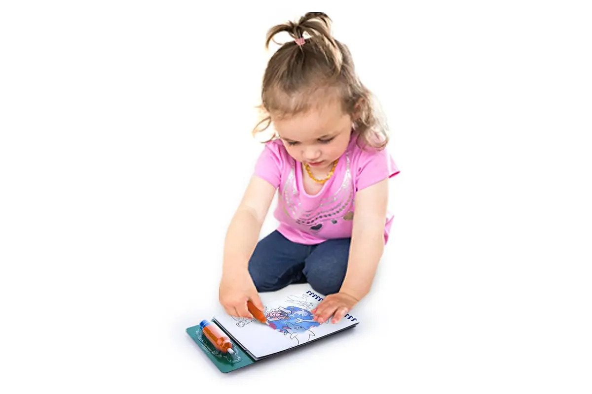 MAGIC WATER AMUSEMENT COLOURING PAD IS A FASCINATING CRAFT TOY THAT WILL SEE A COLOURED IMAGE APPEAR BEFORE YOUR VERY EYES WHEN A WET BRUSH IS APPLIED TO THE PADS SURFACE. THIS LITTLE SET HAS 4 RE-USABLE PAGES ON A SPIRAL BINDER EACH WITH A DIFFERENT AMUSEMENT PARKTHEME. YOU SIMPLY FILL UP THE INCLUDED PEN BRUSH WITH A LITTLE WATER AND GENTLY RUB THE PADS SURFACE WITH THE BRUSH TO MAKE THE IMAGE APPEAR. AS THE PAGE DRIES THE IMAGE DISAPPEARS SO IT CAN BE USED AND REUSED A NUMBER OF TIMES. THE INCLUDED PEN BRUSH IS IDEAL FOR SMALL CHILDREN AS IT ELIMINATES THE NEED FOR SEPARATE POTS OF WATER THAT CAN SO EASILY BE KNOCKED OVER. TO FILL THE PEN BRUSH YOU JUST UNSCREW IT AND FILL IT UP, IT COULDN'T BE EASIER.