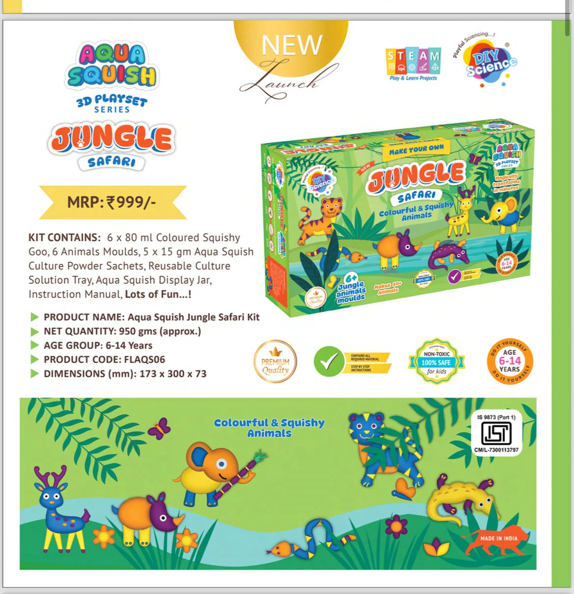 CONTENT JUNGLE SAFARI : - 6 X 80 ML COLOURED SQUISHY GOO, 6 ANIMALS MOULDS, 5X15 GM AQUA SQUISH CULTURE POWDER SACHETS,REUSABLE CULTURE SOLUTION TRAY, AQUA SQUISH DISPLAY JAR & INSTRUCTION MANUAL.