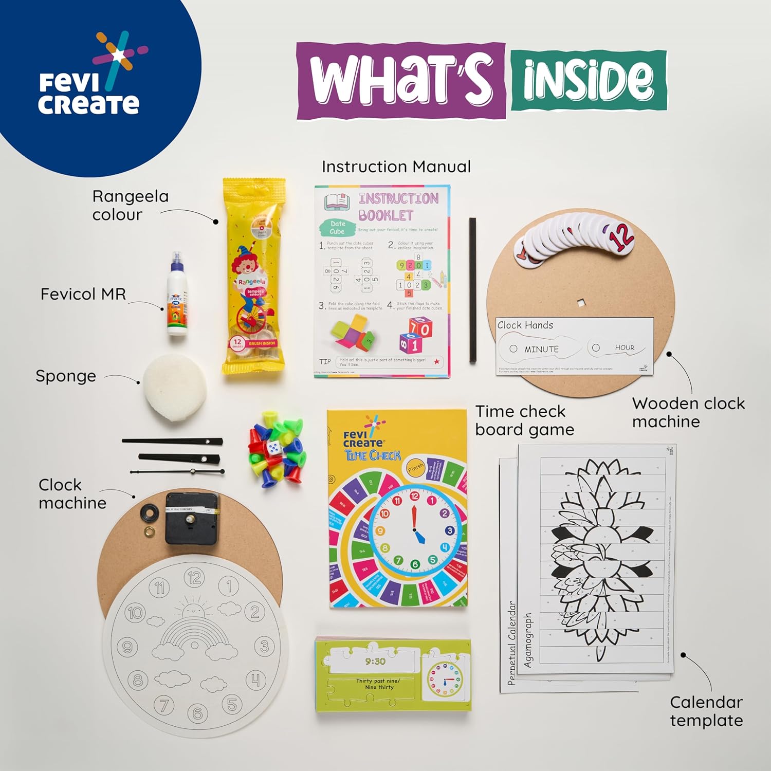IT CONTAINS A WOODEN CLOCK, DAY AND NIGHT AGAMOGRAPH, TELL TIME PUZZLE, TIME CHECK BOARD GAME, WEATHER TREE TEMPLATE, SPONGE, FEVICOL MR, INSTRUCTION MANUAL, PERPETUAL CALENDAR TEMPLATE AND MUCH MORE.