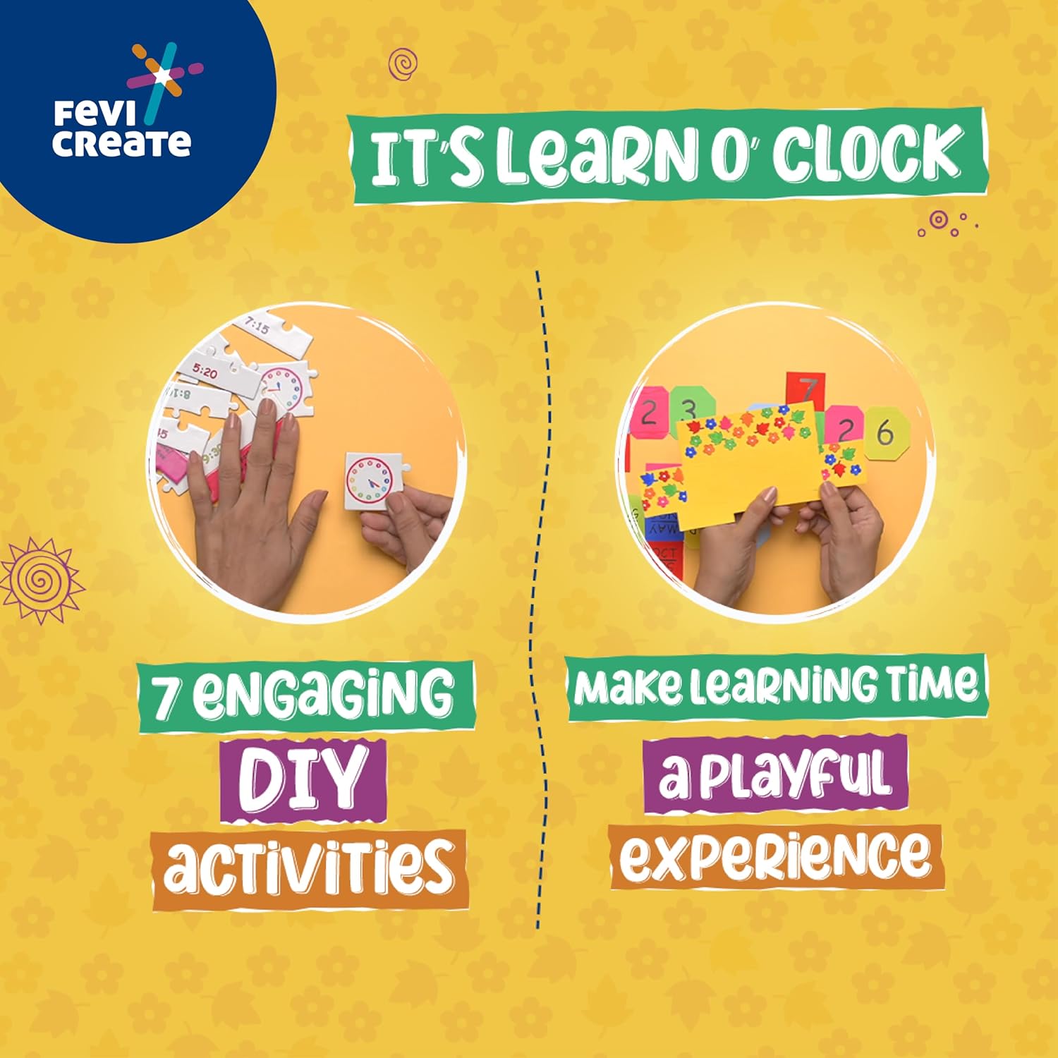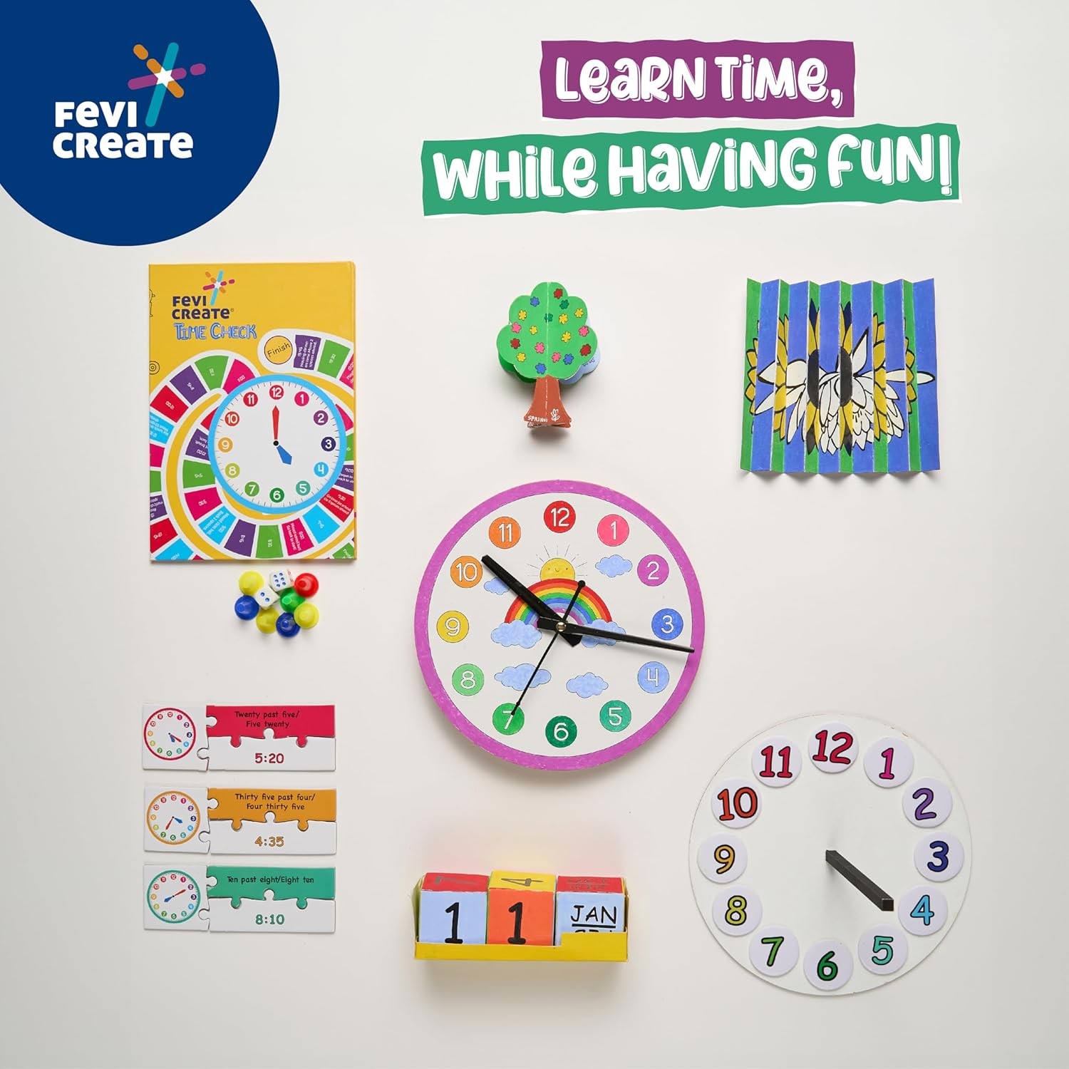FEVICREATE DIY LEARN TIME KIT CRAFT MATERIALS PROVIDED 7 CRAFT ACTIVITIES BOARD GAMES AND PUZZLES. ALL IN ONE SOLUTION ART AND CRAFT KIT LEARN TO READ TIME EASILY.