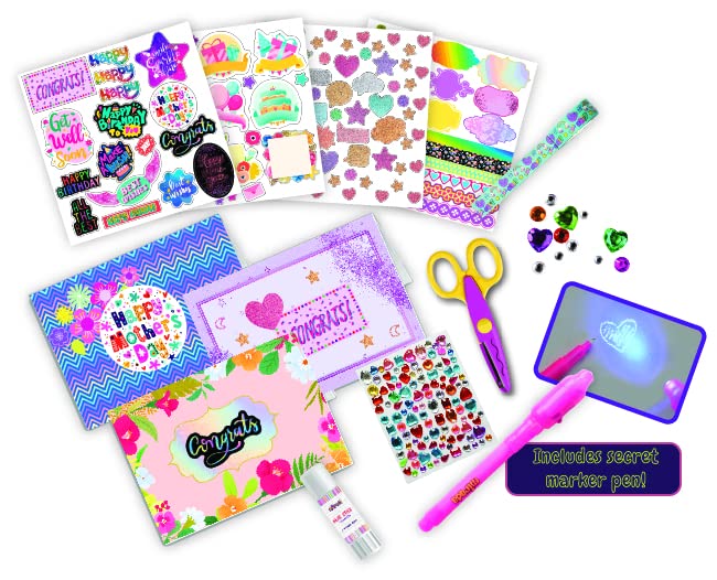 WHAT'S INCLUDED : 12 PRINTED CARDS, 12 ASSORTED ENVELOPES, 55 BASIC STICKERS,158 ALPHABET STICKERS, 138 CUT OUT SHAPES, 100+ STICKY GEMS, 1 SECRET MARKER PEN, 1 WASHI TAPE, 1 FANCY SCISSOR & 1 GLUE STICK.