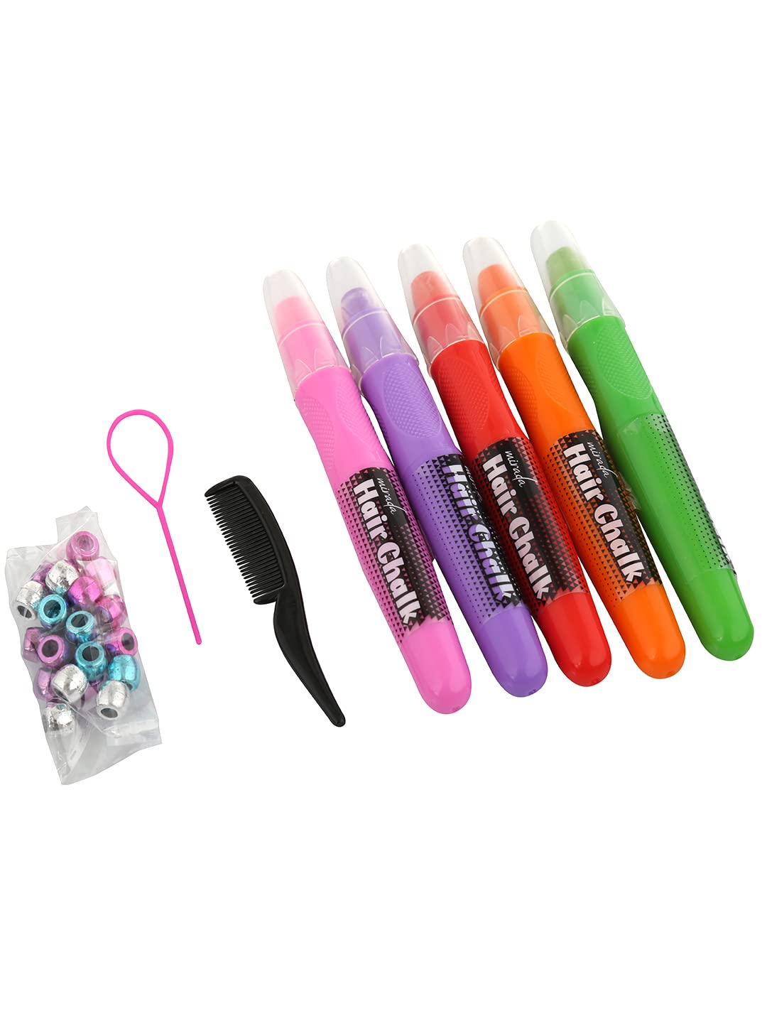 KIT INCLUDES : 5 WASHABLE HAIR CHALK PENS, 24 METALLIC BEADS, HAIR BEADING TOOL, A COMB AND 24 HAIR ELASTICS