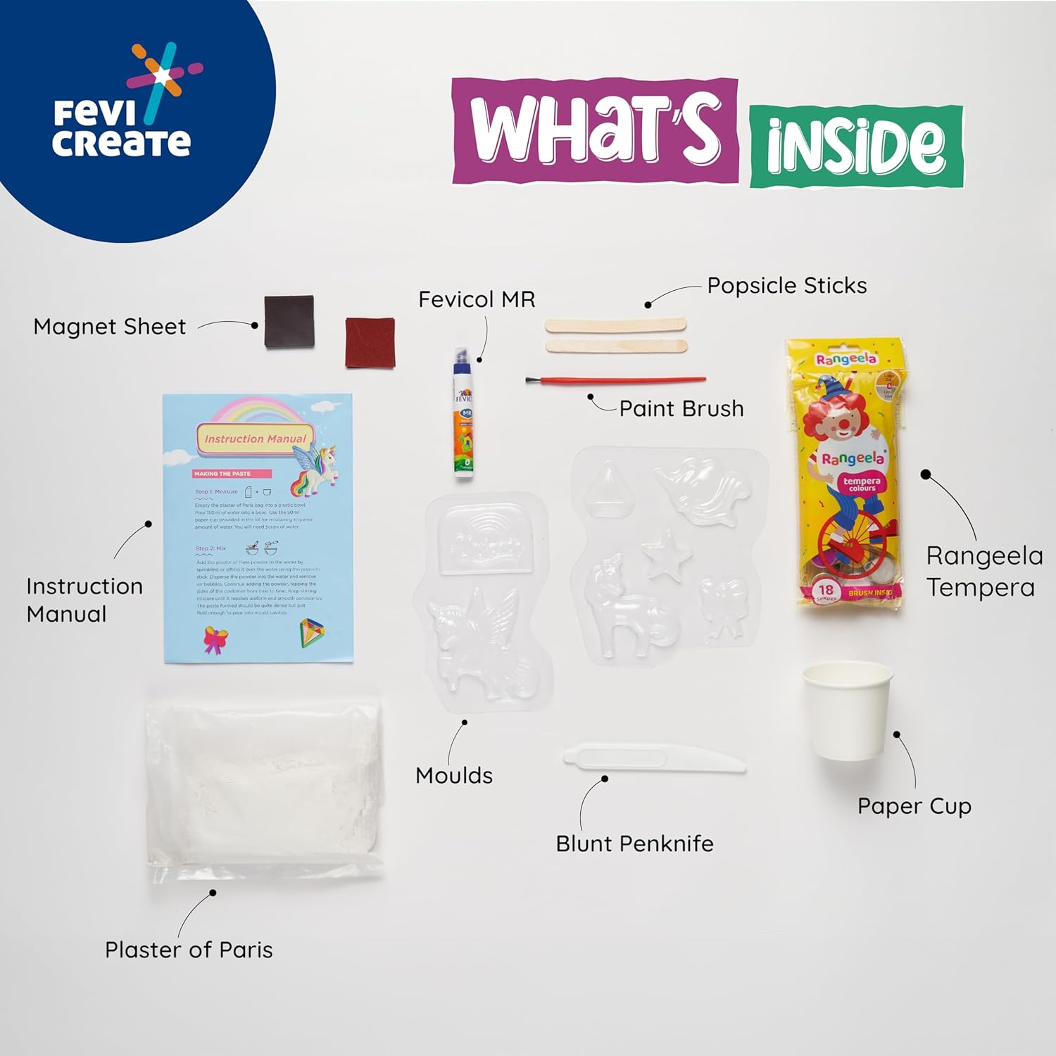 THIS ALL-IN-ONE MAGICAL KIT CONTAINS PLASTER OF PARIS, FEVICOL, A POPSICLE STICK, A BLUNT KNIFE, MOULDS AND MUCH MORE. NO NEED TO BUY MATERIALS SEPARATELY.