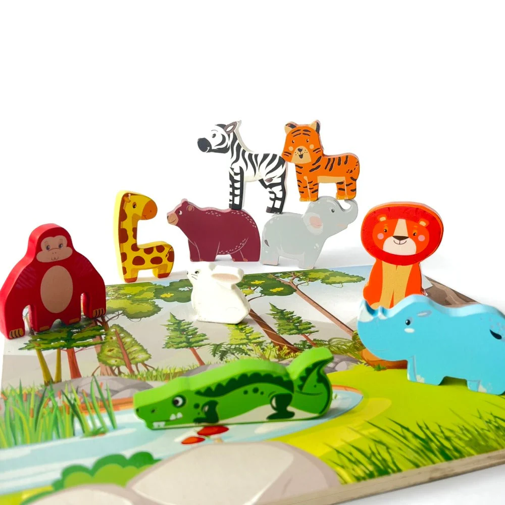An engaging and versatile playtime companion that promises endless fun and learning opportunities. This unique concept combines the best of both worlds: ten self-standing chunky animals on one side and an immersive play scenery on the other.