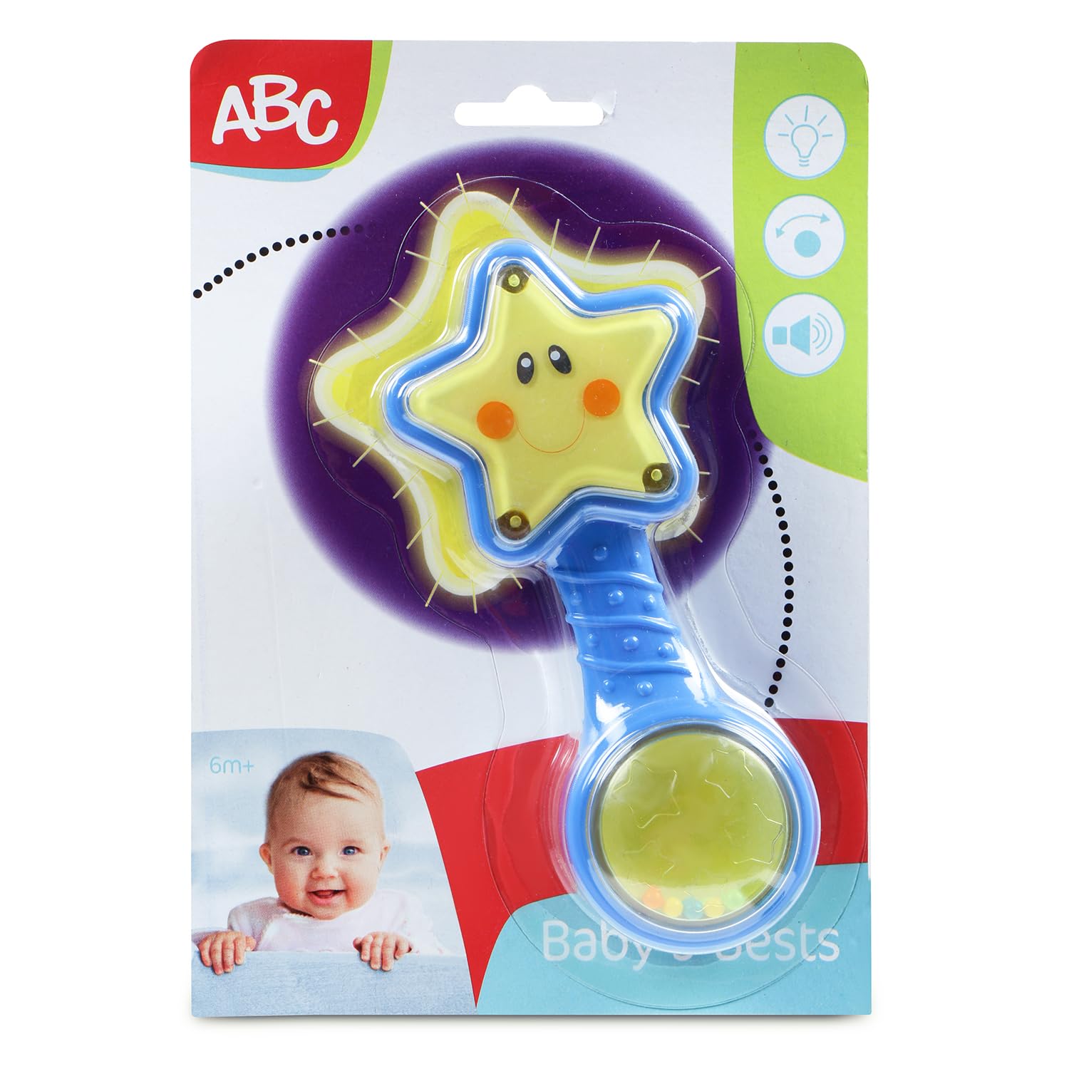 DISCOVER THE WORLD IN A PLAYFUL WAY WITH ABC! ABC AROUSES THE CURIOSITY OF BABIES AND TODDLERS FROM 0-36 MONTHS WITH AGE-APPROPRIATE PRODUCTS AND SUPPORTS THEIR DEVELOPMENT IN THE FIRST YEARS OF LIFE. FIRST LEARNING GOALS ARE ACHIEVED IN A PLAYFUL WAY, FORMS AND STRUCTURES ARE DISCOVERED AND COORDINATION PATTERNS ARE TRAINED. THE ABC STAR RATTLE WITH LIGHT BRINGS TODDLERS A LOT OF JOY. THE BEAUTIFUL STAR RATTLE HAS TWO FUNCTIONS AND IS EASY TO GRIP. IF IT IS SHAKEN, THE SWEET STAR LIGHTS UP BRIGHTLY AND THE COLORFUL BALLS IN THE LOWER PART OF THE RATTLE SOUND. THESE FUNCTIONS MAKE THE ITEM THE PERFECT COMPANION BOTH DAY AND NIGHT. THE RATTLE IS 15CM TALL AND SUITABLE FOR CHILDREN FROM 6 MONTHS. BATTERIES 2X 1.5V LR44 INCLUDED.
