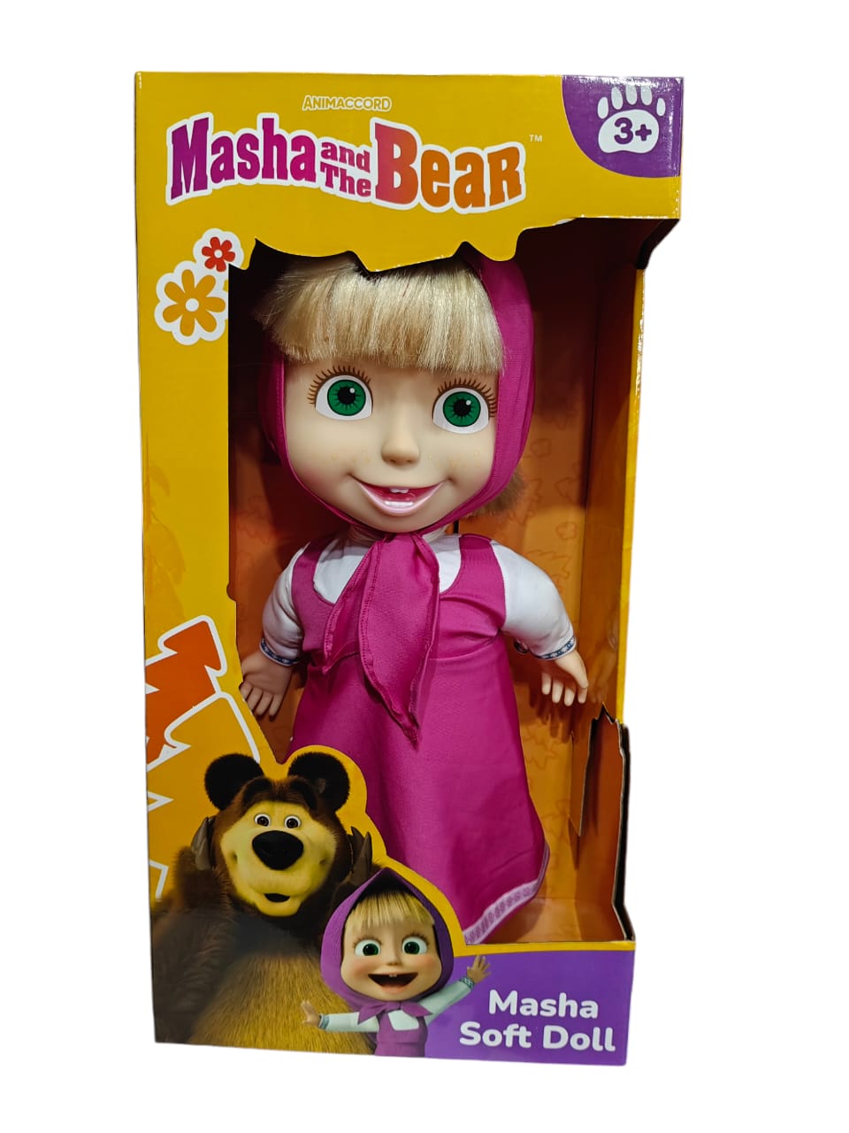 CUTE MASHA FROM THE SERIES “MASHA AND THE BEAR” WANTS TO PLAY. HER HAIR CAN BE COMBED AND SHE IS WEARING HER TRADITIONAL PINK DRESS WITH MATCHING HEADSCARF.