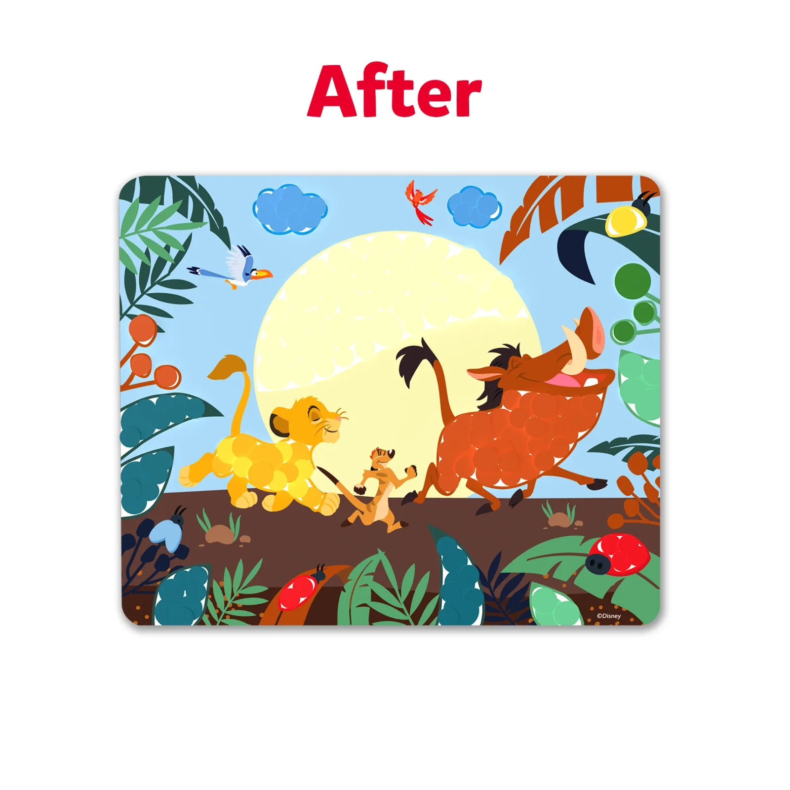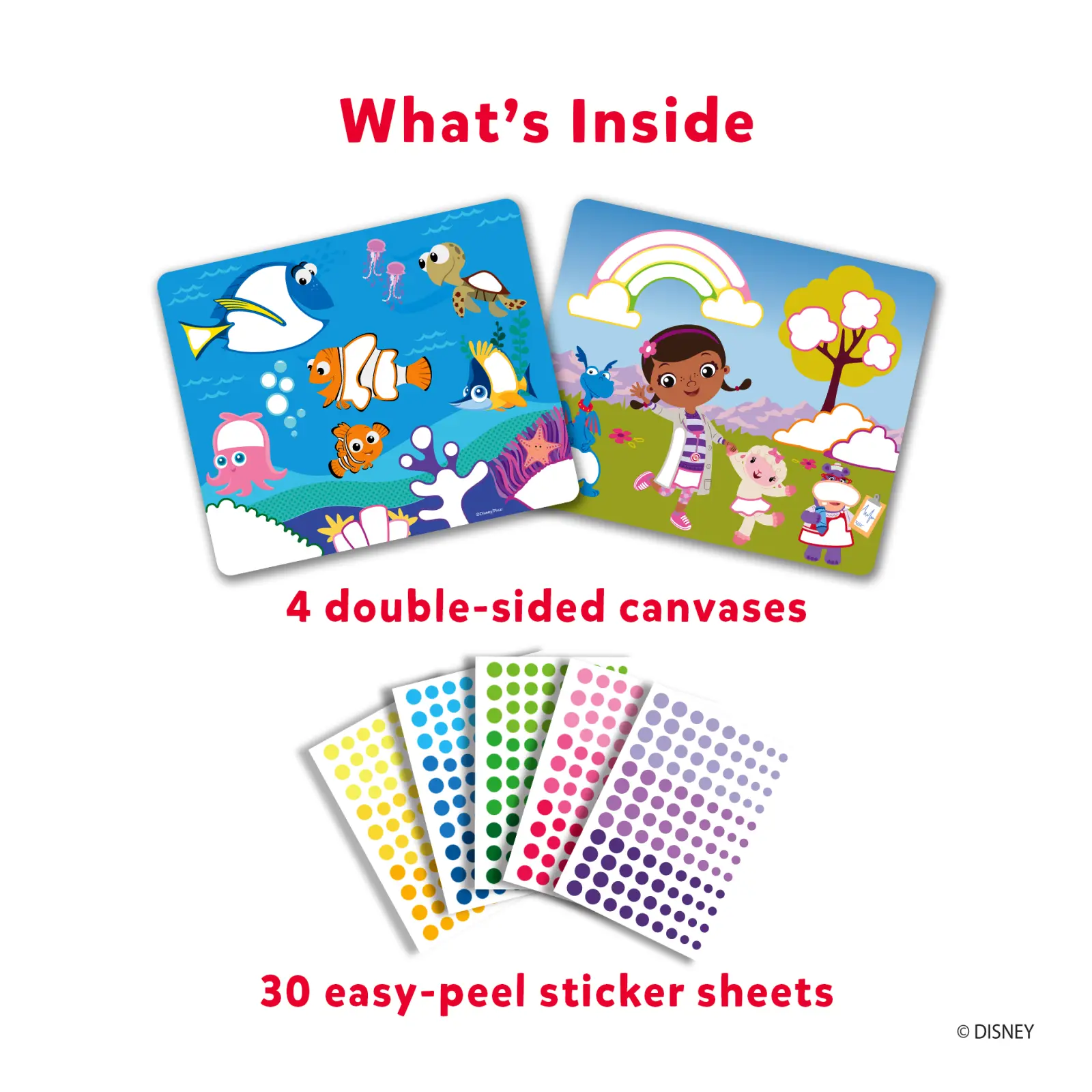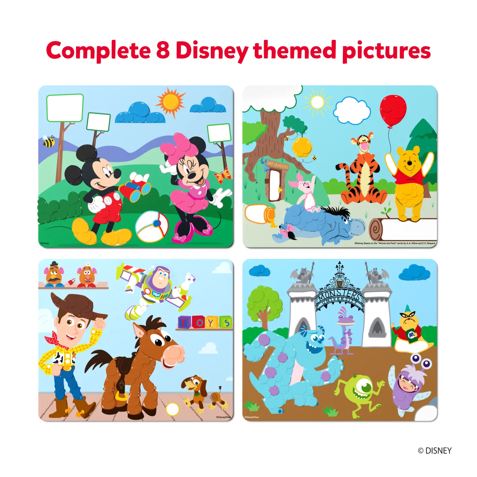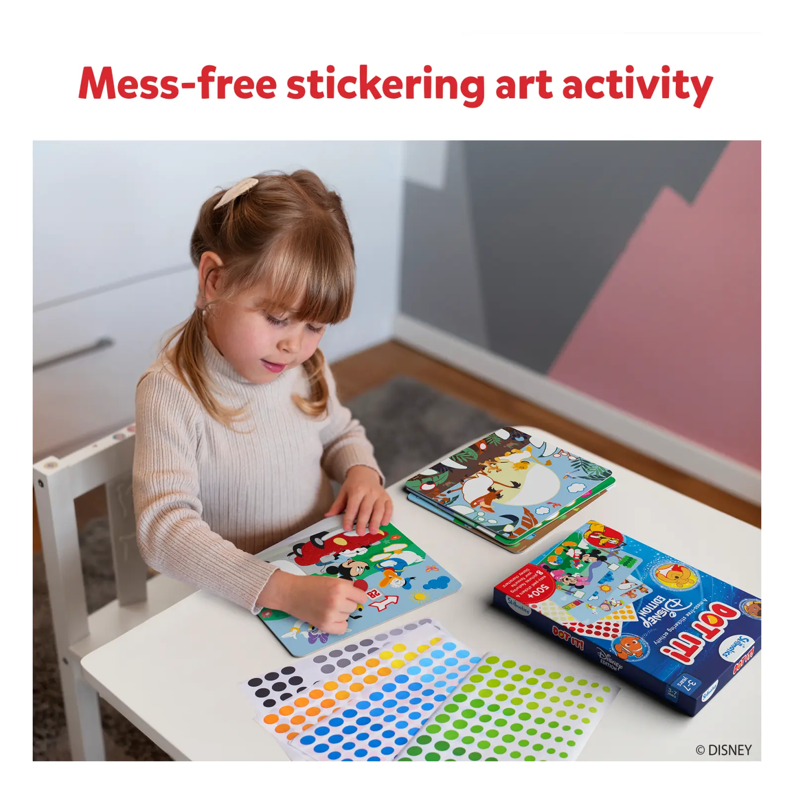 DOT IT! IS THE PERFECT NO-MESS, STICKERING ART ACTIVITY SET TO KEEP YOUR CHILD ENGAGED AT HOME OR ON THE GO! WITH OVER 500 EASY-TO-PEEL COLOURED STICKERS, YOUR CHILD WILL USE THEIR FINE MOTOR SKILLS AND IMAGINATION TO COMPLETE 8 DISNEY CHARACTER-THEMED PICTURES FEATURING MICKEY, SIMBA, WINNIE THE POOH, NEMO AND MORE!