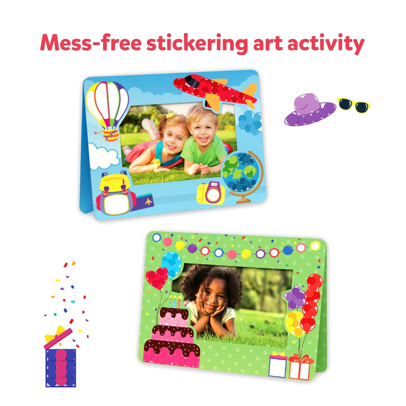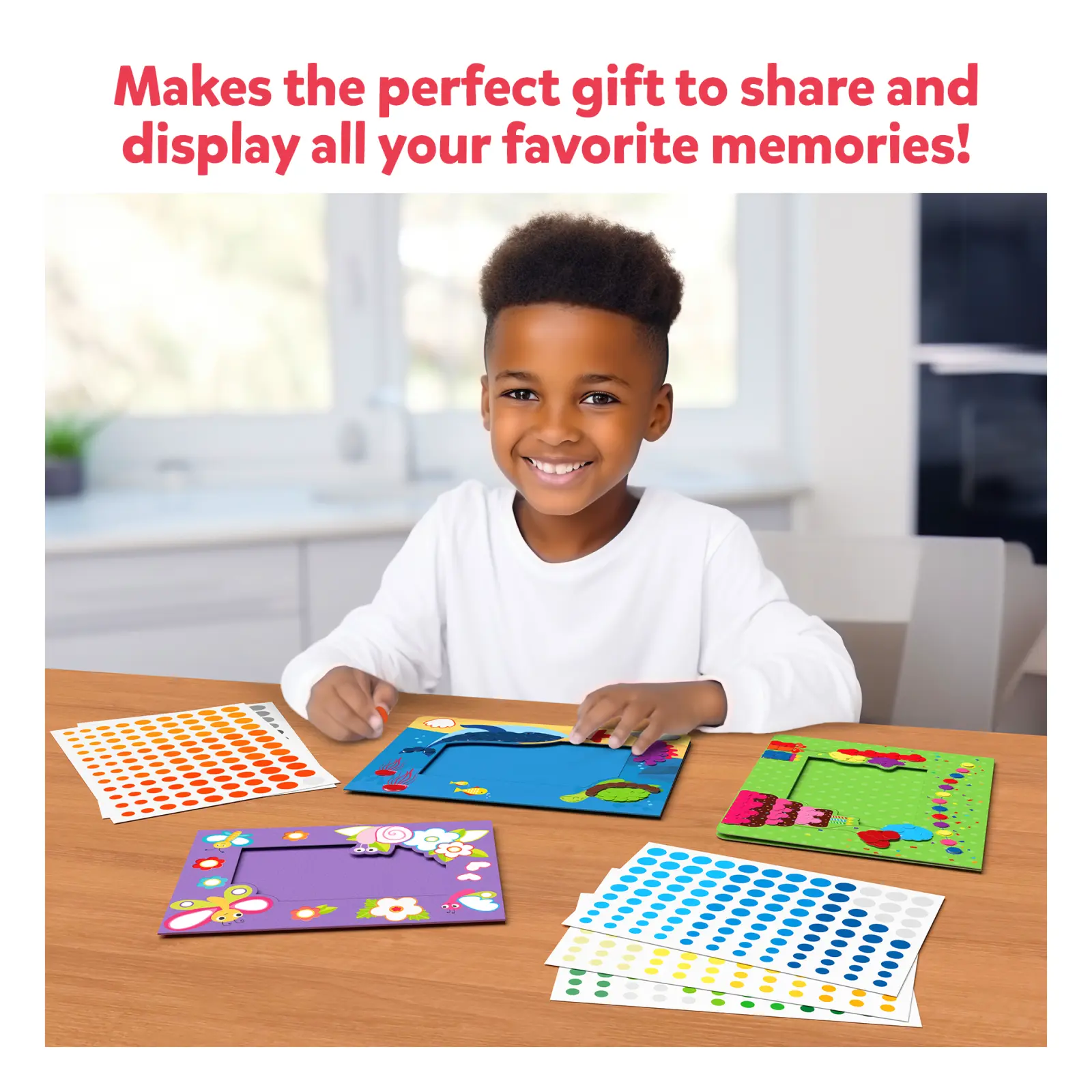 DOT IT! IS THE PERFECT MESS-FREE, STICKERING ART ACTIVITY SET TO KEEP YOUR CHILD ENGAGED AT HOME OR ON THE GO! WITH OVER 500 STICKERS, YOUR CHILD IS ENCOURAGED TO USE THEIR FINE MOTOR SKILLS AND IMAGINATION TO COMPLETE 6 PHOTO FRAMES OF DIFFERENT THEMES INCLUDING A BEACH, TRAVEL, BUTTERFLIES AND FLOWERS, AND MORE! THESE FRAMES ARE PERFECT GIFTS TO GIVE TO LOVED ONES OR TO PROP UP ON SHELVES AS DIY DECOR!