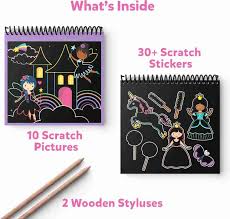 INCLUDES: 10 SCRATCH PICTURES, 2 WOODEN STYLUSES, 30+ SCRATCH STICKERS