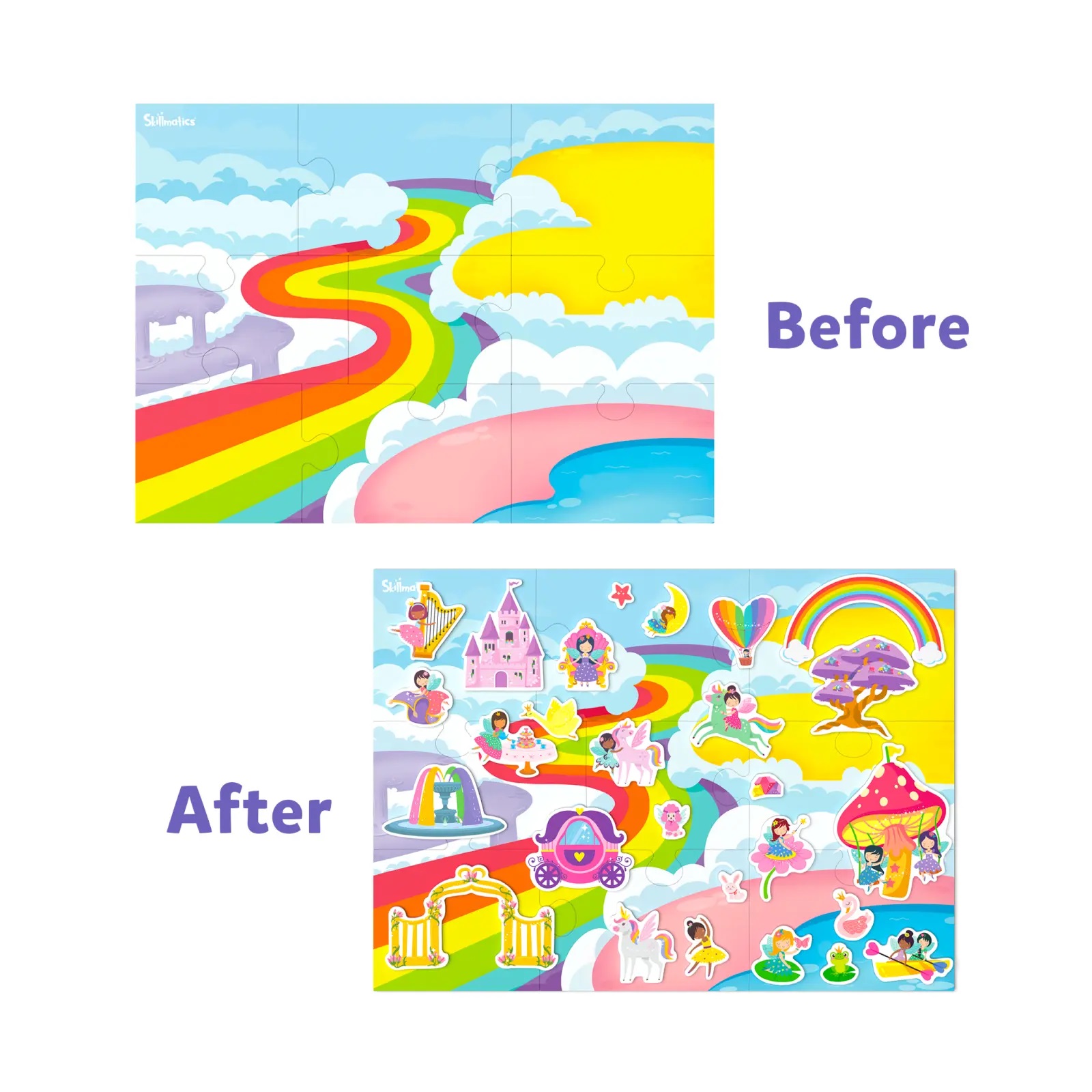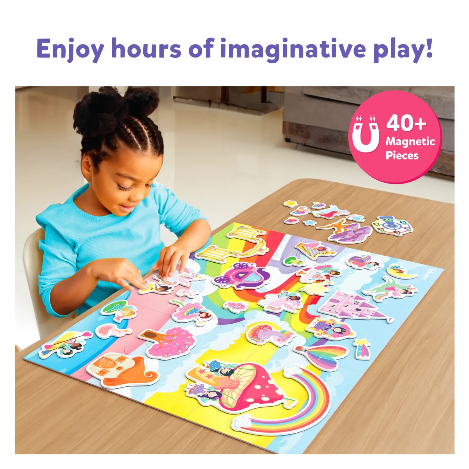 BUILD A WORLD WITH 9 LARGE PUZZLE PIECES TO CREATE THE BACKDROP FOR MAGICAL FUN. THEN ADD PRINCESSES, UNICORNS, CASTLES, FOUNTAINS, AND MORE TO CREATE YOUR VERY OWN WORLD. WITH OVER 40 MAGNETIC PIECES, THE POSSIBILITIES ARE ENDLESS FOR HOURS OF PRETEND PLAY.